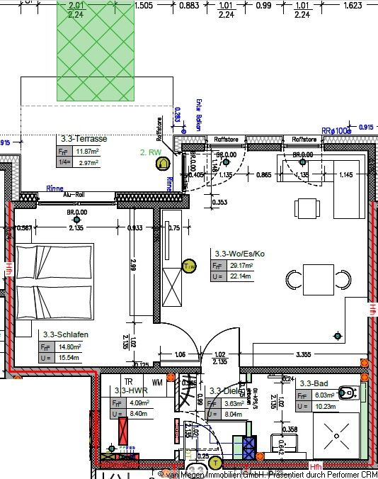 Das neue 21-Familienhaus wird derzeit in solider, qualitativ und handwerklich hochwertiger Bauweise durch die Firma Megens errichtet. Fertigstellungstermin wird ca. Juli 2026 sein, sodass die Mieter das Objekt im August 2026 beziehen können. Das Wohnhaus teilt sich in Erdgeschoss, 1. Obergeschoss, 2. Obergeschoss und Dachgeschoss auf. Das Objekt ist nicht unterkellert. Das Mehrfamilienhaus wird als KFW 40 plus - Haus gebaut. Um einen weiteren Schutz vor Feuchtigkeitsbildung zu haben, erhält jede Wohnung eine kontrollierte Be- und Entlüftungsanlage. Im Objekt wird eine zentrale Luft-Wasser-Wärmpumpe eingebaut. Die Warmwasserversorgung erfolgt über die vorgenannte Wärmpumpenanlage einschließlich Warmwasserspeicher und einer nachgeschalteten Trinkwasserladestation. In den einzelnen Wohnungen sind Fußbodenheizungen mit Raumthermostaten vorhanden. Die Heizkosten werden mit entsprechenden Wärmezählern je Wohneinheit ermittelt und gemäß Heizkostenverordnung abgerechnet. Um eine exakte Frischwasser- und Schmutzkanalabrechnung zu ermöglichen, sind für jede Wohneinheit Wasserzwischenzähler vorhanden. Die Außenwände im Erd- und Obergeschoss sind mit Wärmedämmung lt. Wärmeschutznachweis und einer Verblendung errichtet worden. Das moderne Dach ist umlaufend mit einer Zinkabdeckung eingefasst. Die Dachflächen sind nach Richtlinien des Dachdeckerhandwerks mehrlagig bituminös abgeklebt, einschl. Wärmedämmung nach EnEv. Es wird eine PV-Anlage mit Akkuspeicher auf dem Flachdach installiert. Die jeweiligen Treppenhäuser sind modern errichtet und werden tapeziert. Die Beleuchtung im Treppenhaus erfolgt über Präsenzmelder. Einkäufe können leicht über die vorhandene Aufzugsanlage in die einzelnen Wohnungen transportiert werden. Die Aufzugsanlage ist mit einem Notrufsystem ausgestattet. Es sind Kunststofffenster mit Wärmeschutzverglasung als drei Scheiben Glas mit entsprechenden Profilen gemäß EnEV vorhanden. Die Fensterelemente sind von innen weiß und von außen anthrazit foliert. Die Kunststofffenster der Wohneinheiten erhalten Kunststoffrollladen in grau Standard als Elektrorollladen. Die großen Fensteranlagen mit Anschluss an die Terrassen / Loggien der Wohneinheiten erhalten eine Außenraffstoreanlage in Aluminium mit Elektroantrieb. Die Bedienung der Außenraffstoreanlage erfolgt über einen Kippschalter im Bereich der Fensteranlage. Auf den gemeinschaftlichen Flächen und in den Wohneinheiten werden zur Sicherheit der Bewohner entsprechende Rauchmelder installiert. Gemeinschaftlich wird im Erdgeschoss ein gemeinschaftlicher Müllabstell- und der Fahrradabstellraum genutzt. Das Objekt erhält eine digitale SAT-Anlage. Die benötigten Receiver sind seitens der Bewohner anzuschaffen. Sämtliche Schlafräume und das Wohnzimmer erhalten TV-Anschlüsse. Die Kosten für Hausreinigung und Hauswart sind bereits in den Nebenkosten enthalten. Der zur Wohneinheit gehörende Außenstellplatz ist mit monatlich EUR 40,00 separat zu vergüten. Das Objekt erhält eine Schließanlage.
