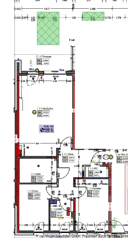 Das neue 12-Familienhaus wird derzeit in solider, qualitativ und handwerklich hochwertiger Bauweise durch die Firma Megens errichtet. Fertigstellungstermin wird ca. Dezember 2025 sein, sodass die Mieter das Objekt im Januar 2026 beziehen können. Das Wohnhaus teilt sich in Erdgeschoss, 1. Obergeschoss, 2. Obergeschoss und Dachgeschoss auf. Das Objekt ist nicht unterkellert. Das Mehrfamilienhaus wird als KFW 40 plus - Haus gebaut. Um einen weiteren Schutz vor Feuchtigkeitsbildung zu haben, erhält jede Wohnung eine kontrollierte Be- und Entlüftungsanlage. Im Objekt wird eine zentrale Luft-Wasser-Wärmpumpe eingebaut. Die Warmwasserversorgung erfolgt über die vorgenannte Wärmpumpenanlage einschließlich Warmwasserspeicher und einer nachgeschalteten Trinkwasserladestation. In den einzelnen Wohnungen sind Fußbodenheizungen mit Raumthermostaten vorhanden. Die Heizkosten werden mit entsprechenden Wärmezählern je Wohneinheit ermittelt und gemäß Heizkostenverordnung abgerechnet. Um eine exakte Frischwasser- und Schmutzkanalabrechnung zu ermöglichen, sind für jede Wohneinheit Wasserzwischenzähler vorhanden. Die Außenwände im Erd- und Obergeschoss sind mit Wärmedämmung lt. Wärmeschutznachweis und einer Verblendung errichtet worden. Das moderne Dach ist umlaufend mit einer Zinkabdeckung eingefasst. Die Dachflächen sind nach Richtlinien des Dachdeckerhandwerks mehrlagig bituminös abgeklebt, einschl. Wärmedämmung nach EnEv. Es wird eine PV-Anlage mit Akkuspeicher auf dem Flachdach installiert. Die jeweiligen Treppenhäuser sind modern errichtet und werden tapeziert. Die Beleuchtung im Treppenhaus erfolgt über Präsenzmelder. Einkäufe können leicht über die vorhandene Aufzugsanlage in die einzelnen Wohnungen transportiert werden. Die Aufzugsanlage ist mit einem Notrufsystem ausgestattet. Es sind Kunststofffenster mit Wärmeschutzverglasung als drei Scheiben Glas mit entsprechenden Profilen gemäß EnEV vorhanden. Die Fensterelemente sind von innen weiß und von außen anthrazit foliert. Die Kunststofffenster der Wohneinheiten erhalten Kunststoffrollladen in grau Standard als Elektrorollladen. Die großen Fensteranlagen mit Anschluss an die Terrassen / Loggien der Wohneinheiten erhalten eine Außenraffstoreanlage in Aluminium mit Elektroantrieb. Die Bedienung der Außenraffstoreanlage erfolgt über einen Kippschalter im Bereich der Fensteranlage. Auf den gemeinschaftlichen Flächen und in den Wohneinheiten werden zur Sicherheit der Bewohner entsprechende Rauchmelder installiert. Gemeinschaftlich wird im Erdgeschoss ein gemeinschaftlicher Müllabstell- und der Fahrradabstellraum genutzt. Das Objekt erhält eine digitale SAT-Anlage. Die benötigten Receiver sind seitens der Bewohner anzuschaffen. Sämtliche Schlafräume und das Wohnzimmer erhalten TV-Anschlüsse. Die Kosten für Hausreinigung und Hauswart sind bereits in den Nebenkosten enthalten. Der zur Wohneinheit gehörende Außenstellplatz ist mit monatlich EUR 40,00 separat zu vergüten. Das Objekt erhält eine Schließanlage.