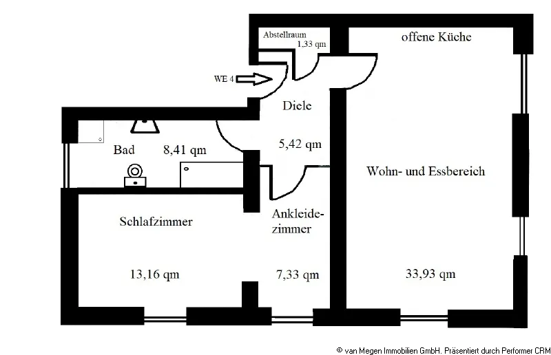 Die zu vermietende Wohnung im 1. Obergeschoss besteht aus 2 Zimmern, offener Küche, Ankleidezimmer, Diele, Abstellraum und Badezimmer. Die gesamte Wohneinheit wurde seitens des Eigentümers bis auf das Badezimmer im Kalenderjahr 2021 umfangreich saniert. Die Wohnung ist mit einem hochwertigen Vinylboden in Holzoptik ausgestattet. Türzargen und Türblätter sind weiss. Der Wohn- und Essbereich mit offener Küche hat eine Größe von ca. 33,93 m² und ist der größte Raum der Wohnung. Im Küchenbereich ist ein großformatiger weißer Fliesenspiegel angebracht. Das Badezimmer hat eine Größe von ca. 8,41 qm und ist mit braun-beigen Boden- und Wandfliesen türhoch ausgestattet. Das Badezimmer ist mit einer Badewanne und einer separaten Dusche ausgestattet. Zur ordnungsgemäßen Belüftung ist im Bad ein separates Fenster vorhanden. Von der ca. 5,42 qm großen Diele kann man auch den ca. 1,33 qm großen Abstellraum betreten. Dieser eignet sich ideal zum Abstellen von Putzutensilien oder Vorräten. Das Schlafzimmer nebst separatem Ankleidebereich ist 20,49 qm groß und bietet ausreichend Stellfläche für Bett und Schrankelemente.